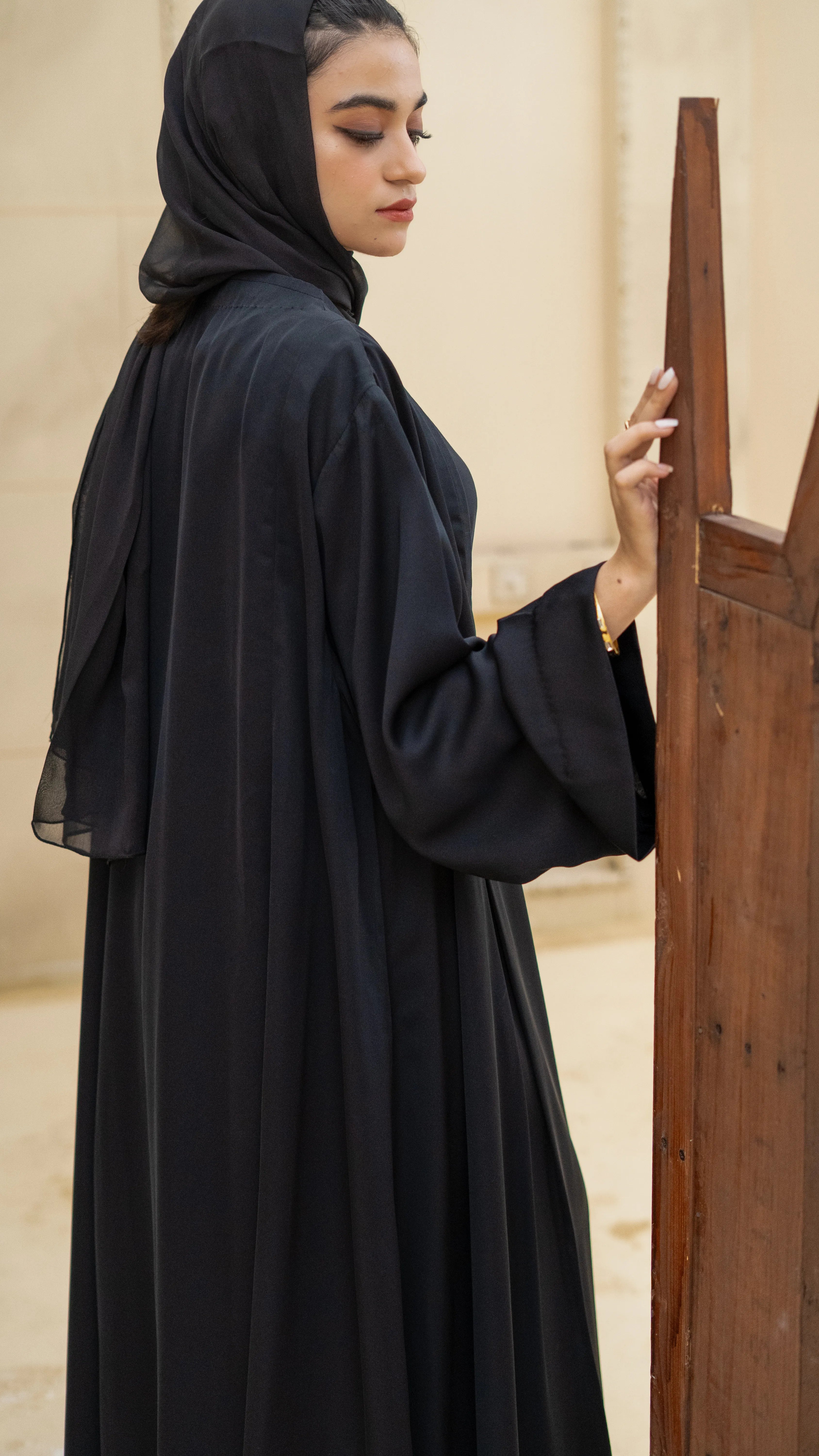 Our Classic Black Abaya is made from soft Nida fabric that feels light and flows beautifully. It has two gentle pleats in the front and back that give it an elegant shape while keeping it modest and simple.