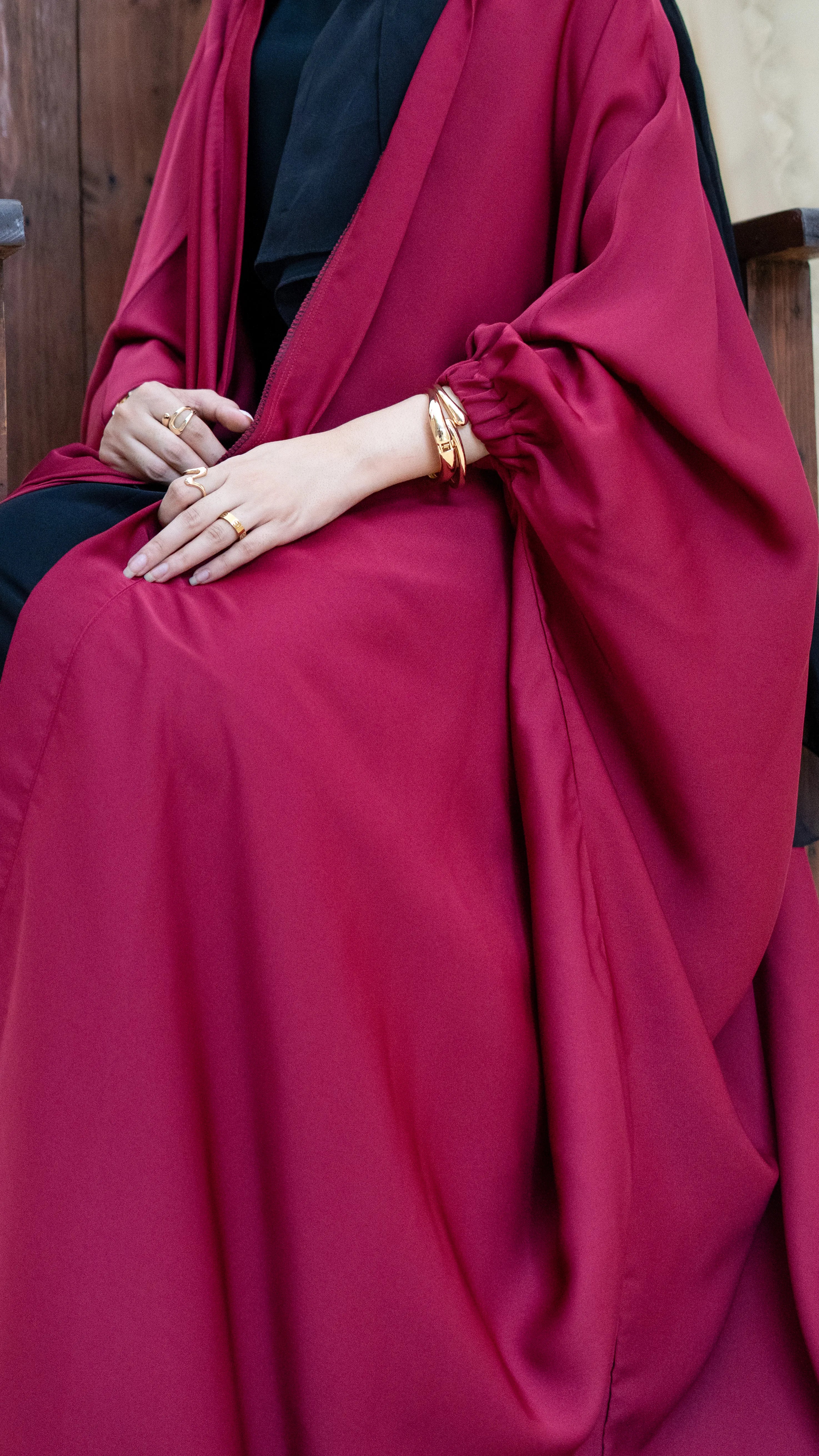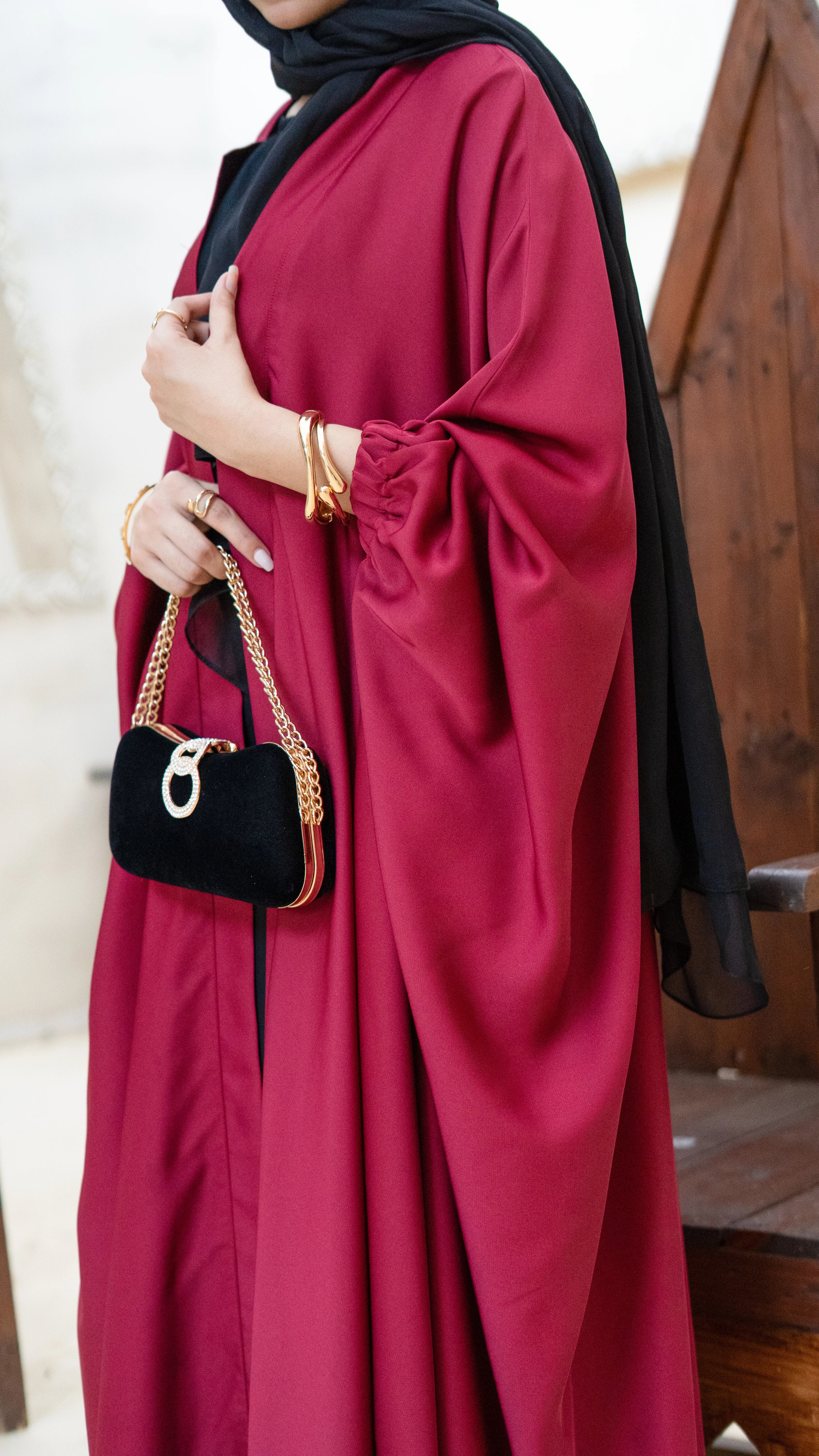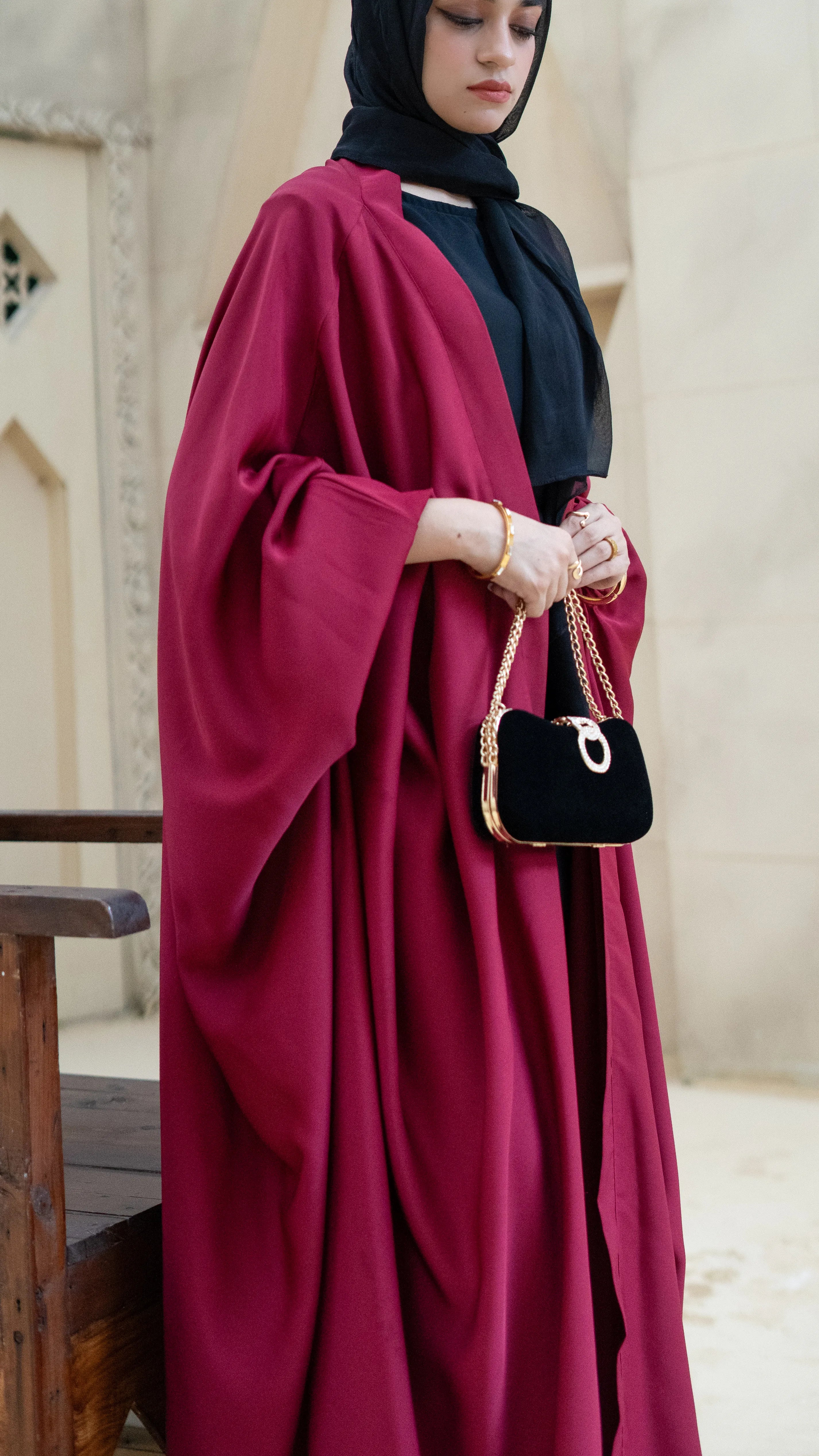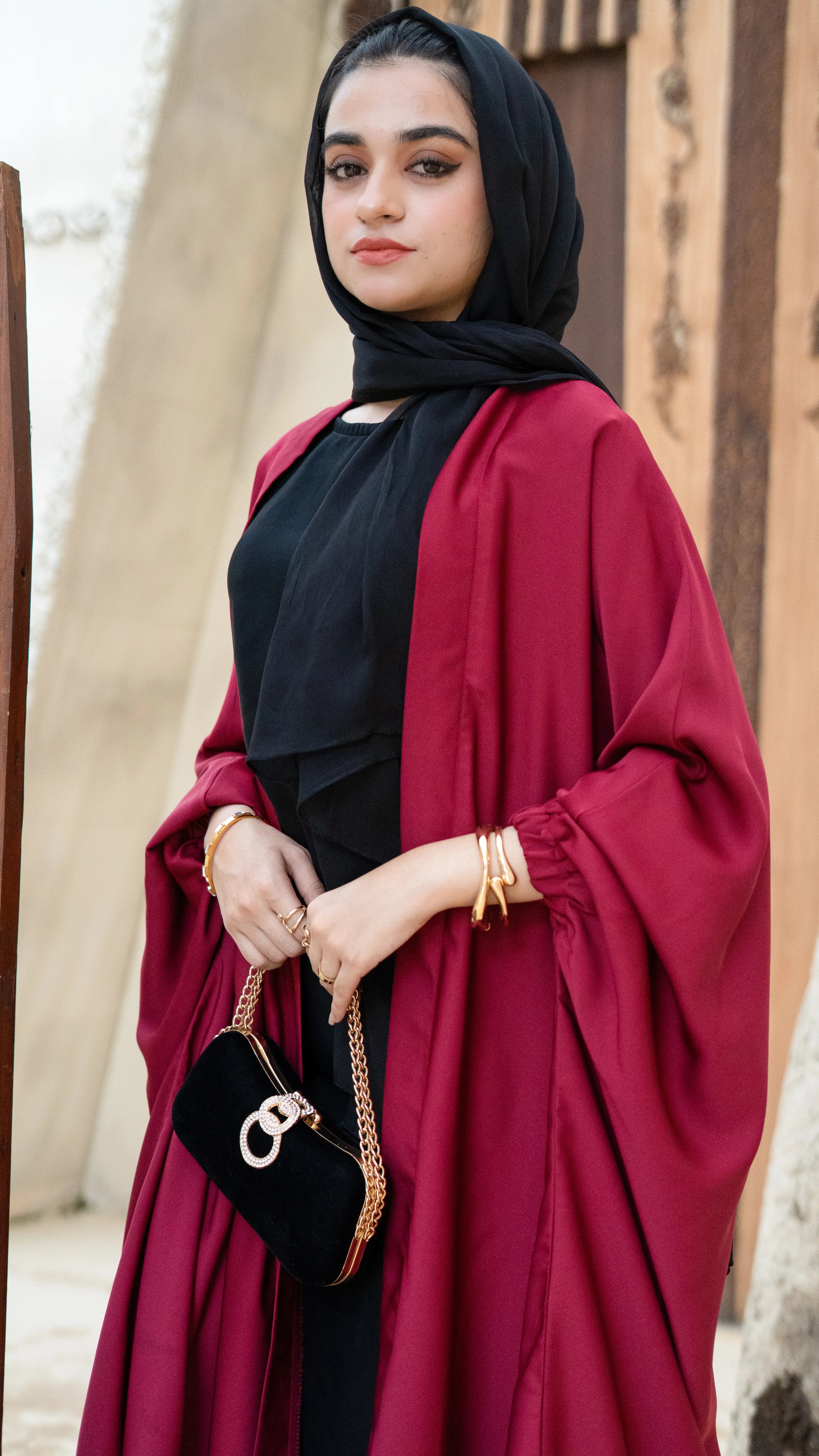 Our Wine Red Batwing Velora Abaya is made from premium Nida fabric, giving it a soft, elegant, and flowy feel. Its batwing design with gathered cuff sleeves adds a touch of grace to every step, while the black adjustable inner creates a beautiful contrast that enhances the overall look. The lightweight fabric makes it perfect for any occasion, offering a balance of comfort, modesty, and effortless style that lets you move with that graceful princess walk.